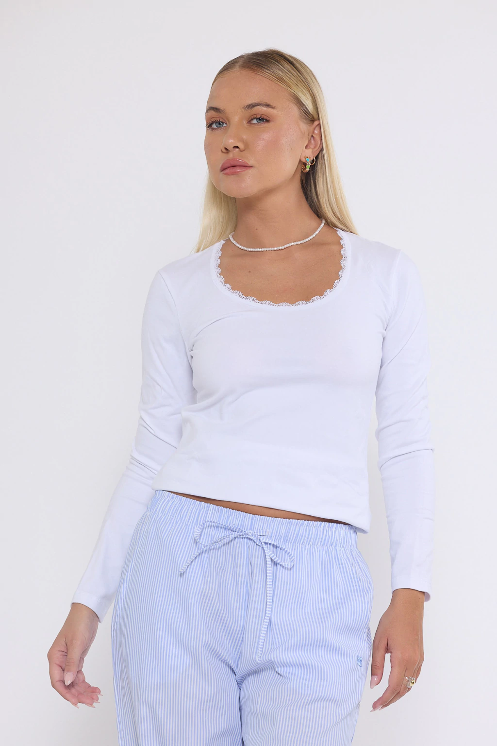 Camiseta basica de manga larga y cuello redondo confeccionada en algodon con lycra de calidad superior, es larga hasta la cadera y tiene puntilla en cuello.
