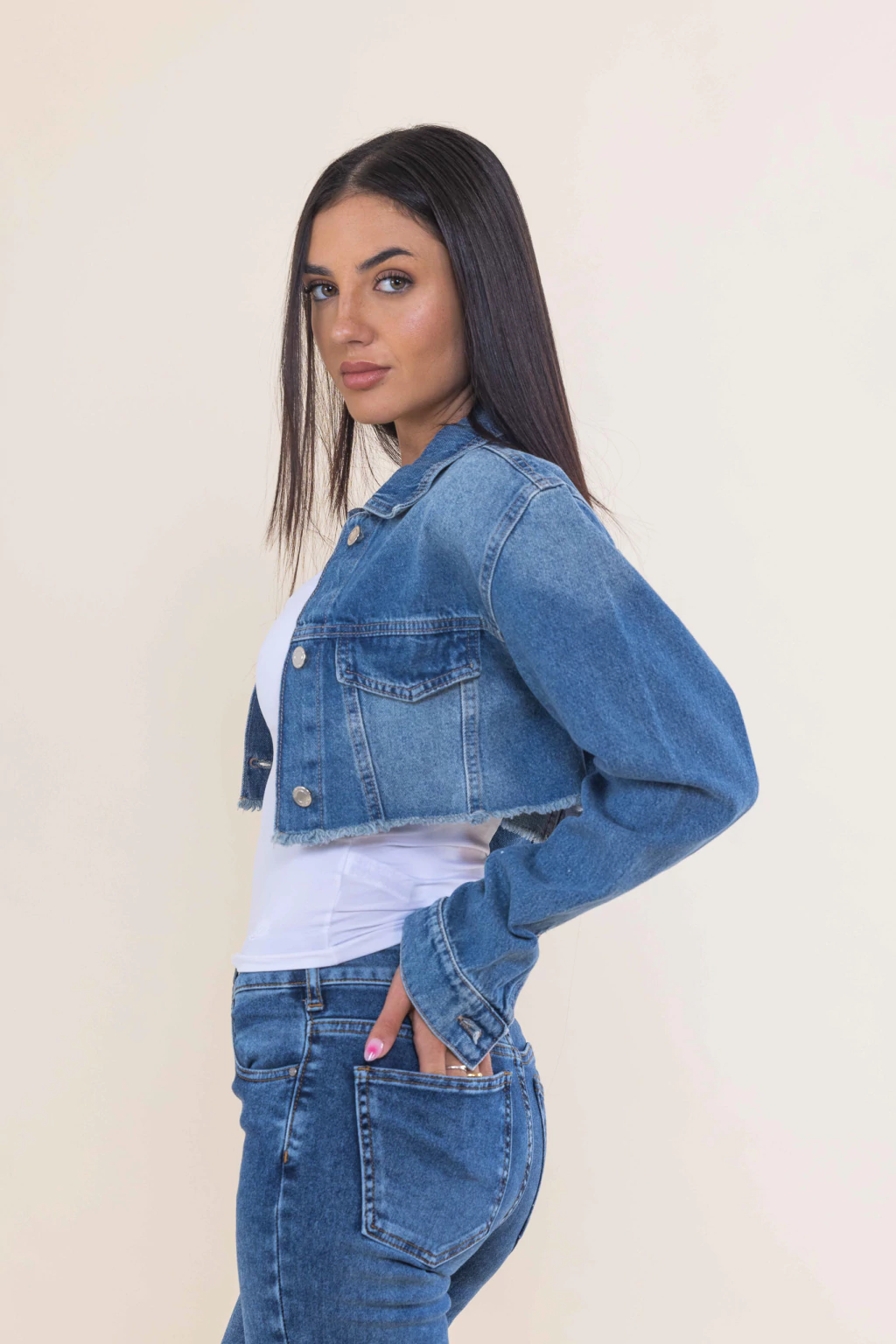 Campera corta denim con bolsillos. Confeccionado en denim rigido sin elastano, de color azul.