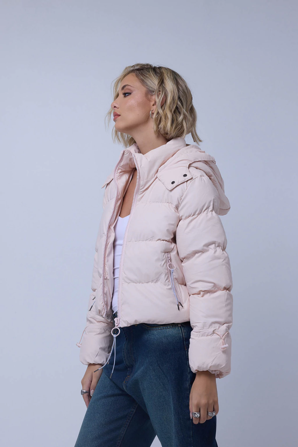 Campera puffer super acolchada, cuello alto, con capucha y detalles de cordones elasticos en cintura y en puños para ceñir esta zona. Material poliester relleno de fibras de poliester siliconado, 100% forrada. Soporta temperaturas extremas hasta -5º C . Calidad premium. A modo de referencia: la modelo esta usando talle S: mide 1,72 Mts