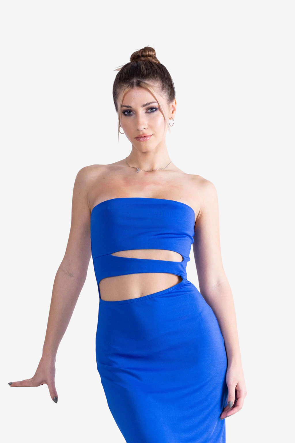 Vestido strapless largo tubo con recortes. La modelo mide 1,68 mts y esta usando talle S.